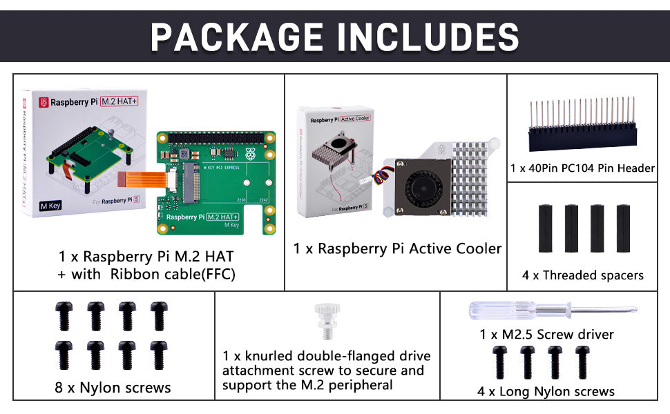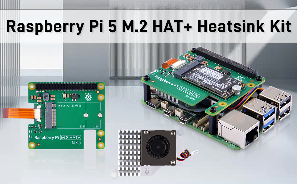 This kit contains Raspberry Pi M.2 HAT+ and Raspberry Pi Active Cooler for Raspberry Pi 5. The Raspberry Pi M.2 HAT+ M Key enables you to connect M.2 peripherals such as NVMe drives and other PCIe accessories to Raspberry Pi 5’s PCIe interface.