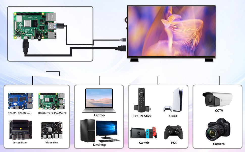 • Multi-purpose Usage: Besides serving as a portable screen for SBC development boards, it can also function as a secondary display for PCs, expanding your workspace. Additionally, it can be incorporated into DIY projects for added functionality.
